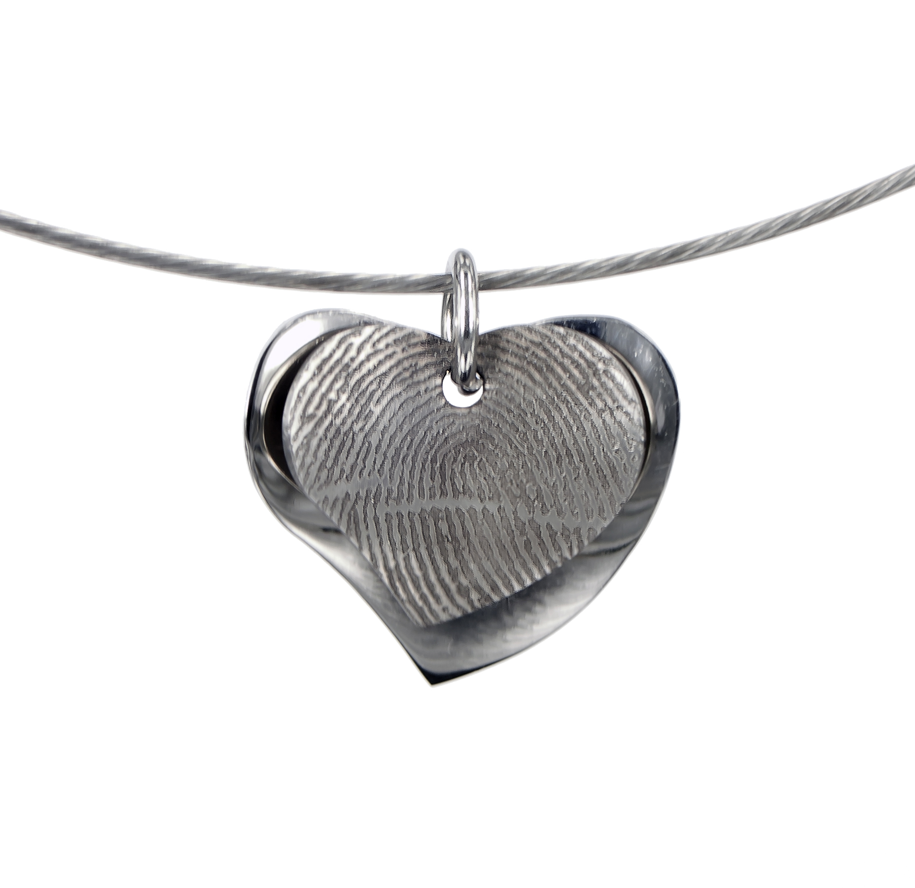Hartvormige hanger met gelasergraveerde vingerafdruk bestaande uit 2 losse platen.Â