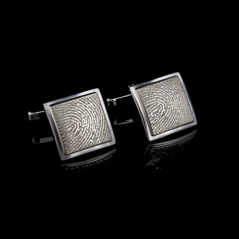 Manchetknopen met daarop de afdruk van uw dierbare. Dit kan een afdruk zijn van een vinger, hand, dierenpoot, babyhandje of babyvoetje. Wij kunnen met alle afdrukken overweg: inkt, was, rubber, etc.