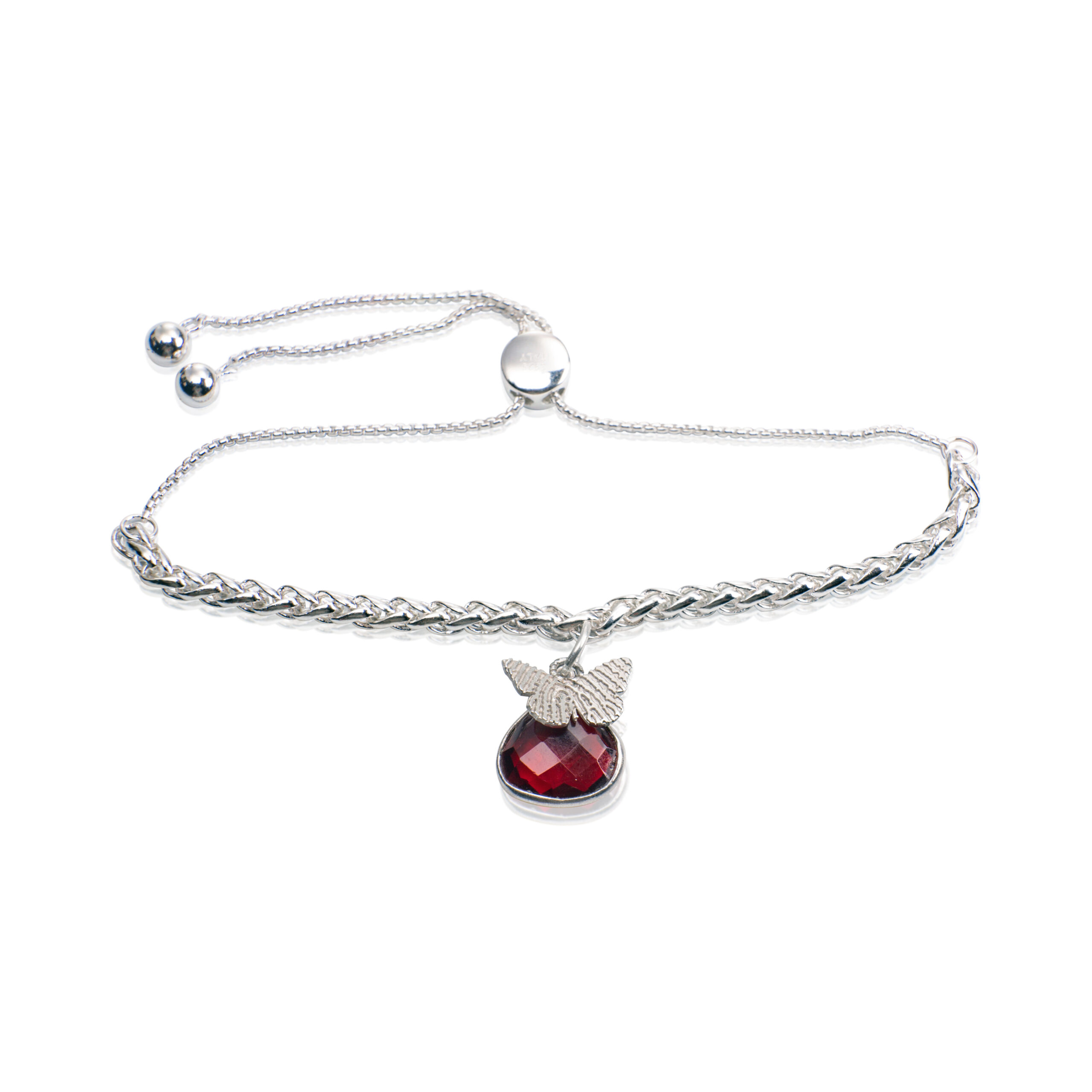 Verstelbaar gevlochten armbandje met twee hangers: een vlindervormige hanger met afdruk en een rode dubbel facet geslepen rode kwarts.