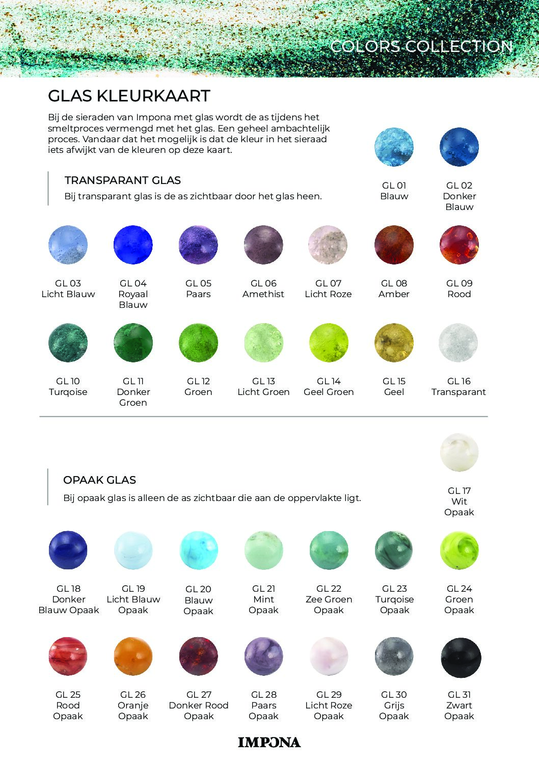 GL01 Blauw, GL02 Donker blauw, GL03 Licht blauw, GL04 Royaal blauw, GL05 Paars, GL06 Amethist, GL07 Lichtroze, GL08 Amber, GL09 Rood, GL10 Turqoise, GL11 Donker groen, GL12 Groen, GL13 Licht groen, GL14 Geelgroen, GL15 Geel, GL16 Transparant, GL17 Wit opaak, GL18 Donker blauw opaak, GL19 Licht blauw opaak, GL20 Blauw opaak, GL21 Mint opaak, GL22 Zee groen opaak, GL23 Turqoise opaak, GL24 Groen opaak, GL25 Rood opaak, GL26 Oranje opaak, GL27 Donker rood opaak, GL28 Paars opaak, GL29 Licht roze opaak, GL30 Grijs opaak, GL31 Zwart opaak