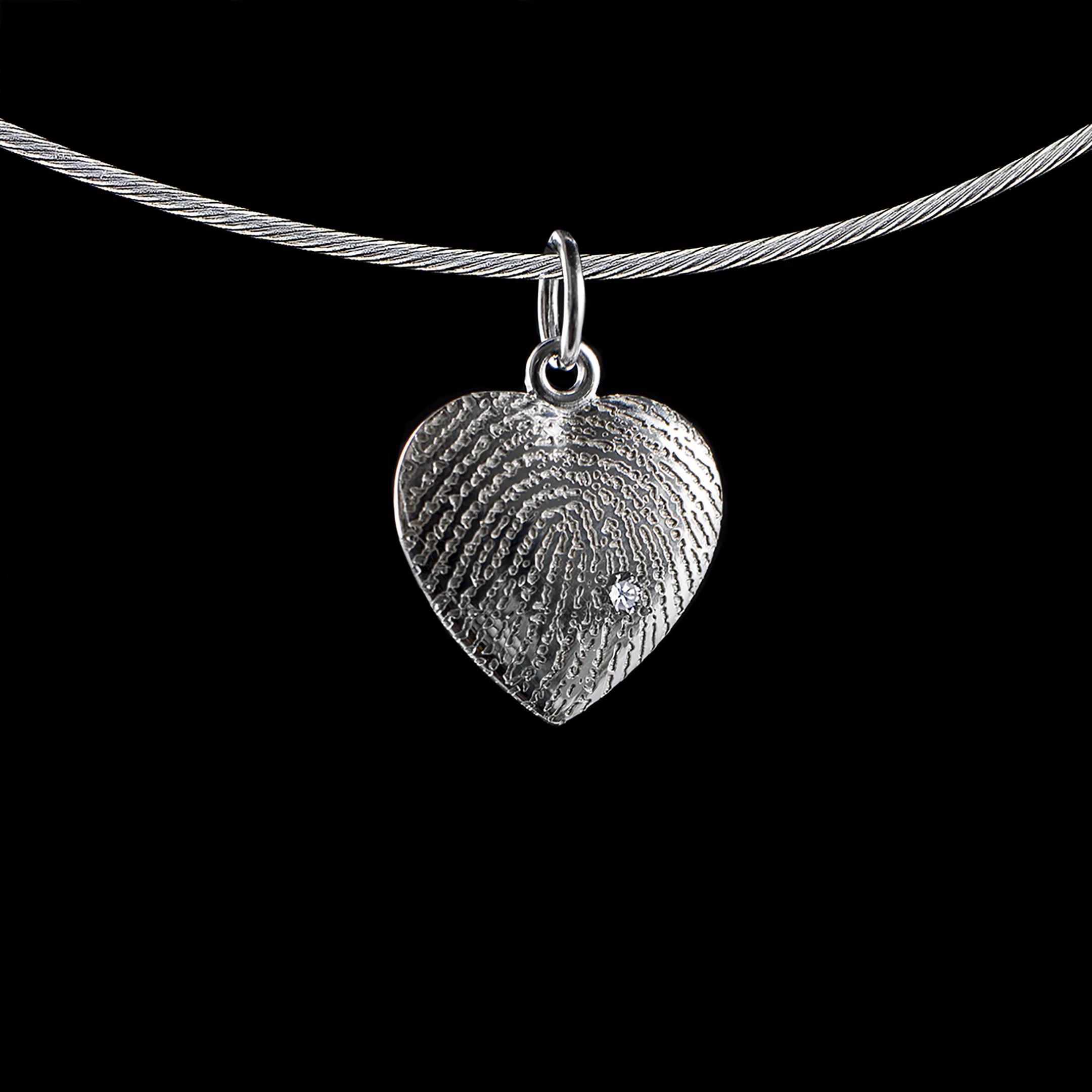 Hartvormige hanger met vingerafdruk en zirkonia. Dikte: 6.5mm, doorgang ketting: 2.5mm.