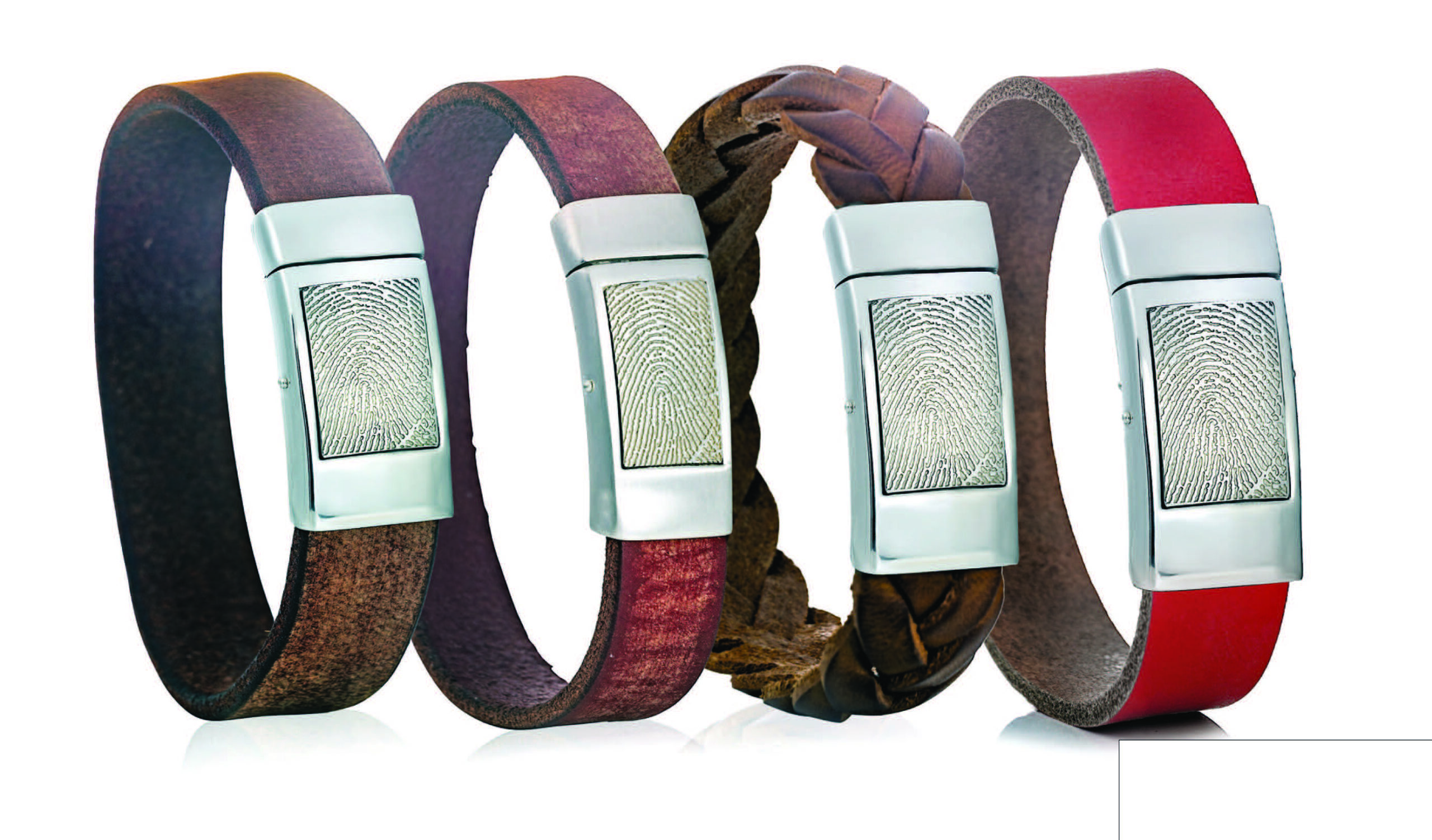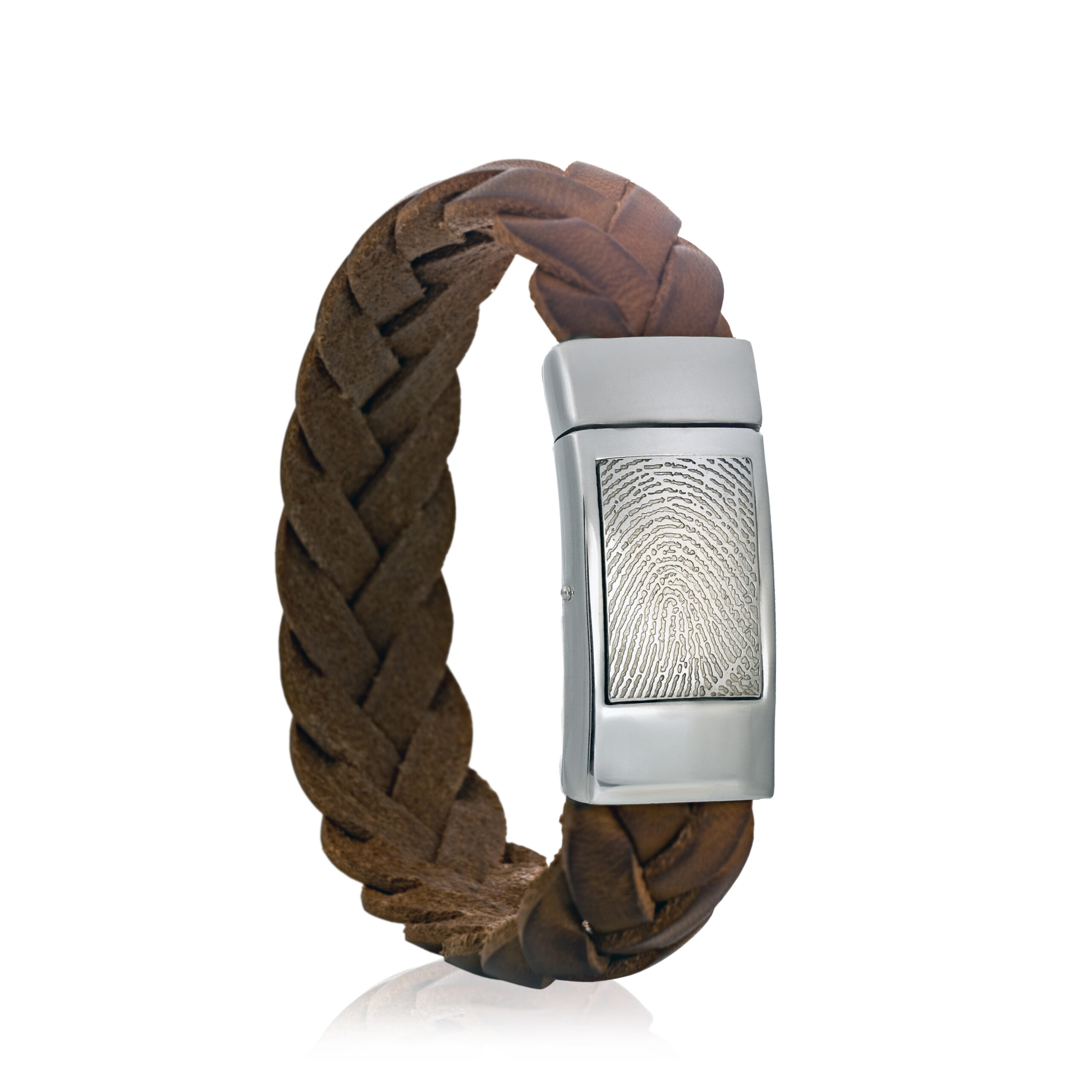 Deze leren armband met zilveren drukslot biedt een stijlvolle en persoonlijke manier om een herinnering dichtbij te houden. Het zilveren slot, met afmetingen van 34 x 15 mm, kan worden gegraveerd met een unieke vingerafdruk. Dankzij de aanpasbare leerkleuren en keuze uit een glanzende of matte afwerking, kun je jouw armband geheel personaliseren.”