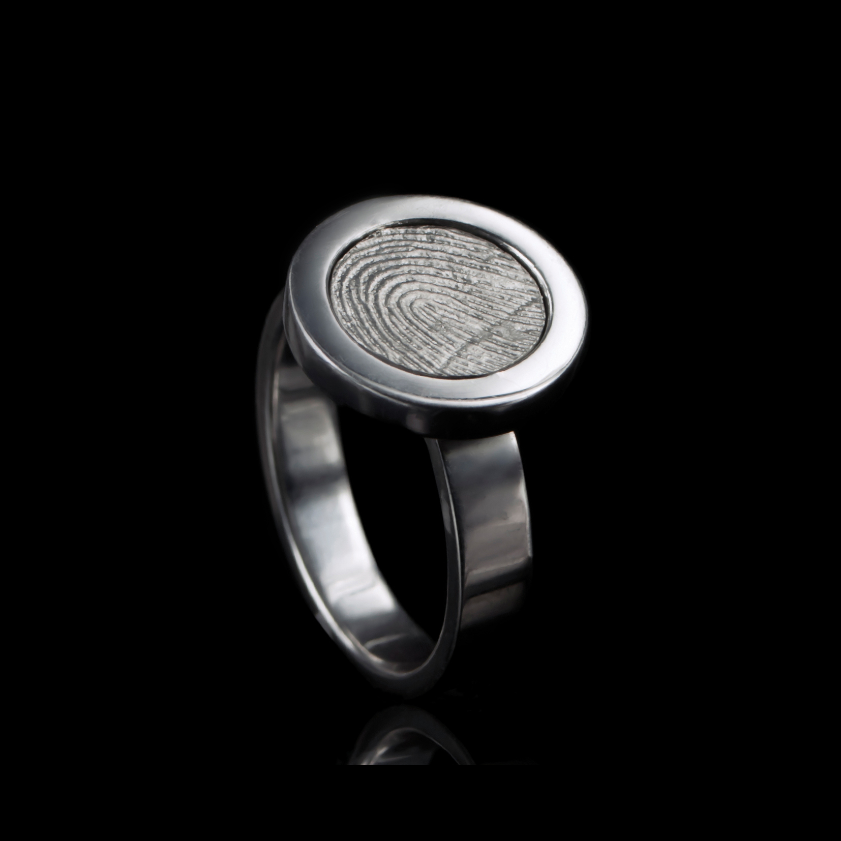 Een elegante ring met een ronde, verdiept liggende vingerafdruk en brede rand. De afdruk kan gegoten worden in zilver of gegraveerd, afhankelijk van de aangeleverde afdruk.